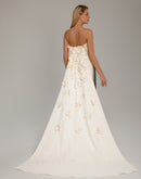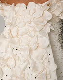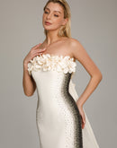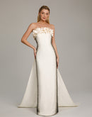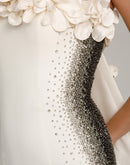 فستان سهرة فاخر باللون الأبيض العاجي، بقصة ناعمة ومستقيمة، مزين بتطريزات زهور ثلاثية الأبعاد يدوياً تزيّن الصدر وتتدفق بأناقة على الظهر.