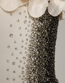يكتمل التصميم بذيل واسع ومنساب مزين بالزهور والكريستالات لمنظر راقٍ وأنثوي.