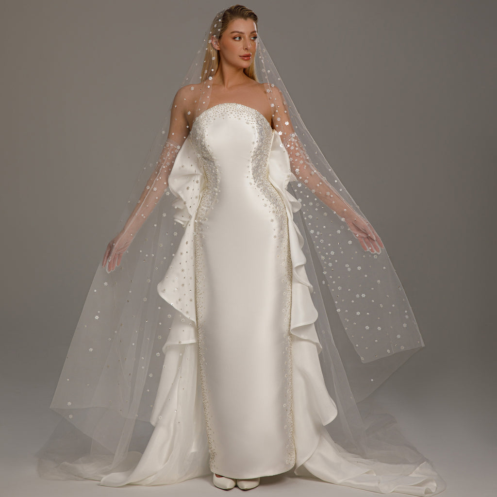 فستان زفاف فاخر باللون الأبيض العاجي مصنوع من قماش ميكادو اللامع، يتميز بقصة مستقيمة بدون أكتاف. مزدان بتطريز يدوي رائع من الخرز والكريستالات يتدفق بأناقة على الجانبين لمنظر راقٍ ومتقن. يعرض الفستان تفاصيل جانبية متقنة بحرفية ع...