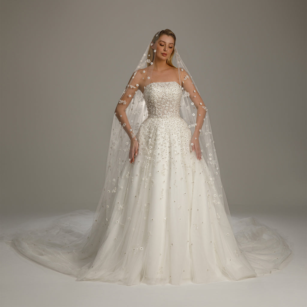 فستان زفاف فاخر باللون الأبيض العاجي يتميز بقصة أنثوية على شكل حرف A، مصنوع من التول الناعم ومزين بتطريز يدوي معقد باستخدام اللؤلؤ والخرز والكريستالات والزخارف الزهرية. يكتمل التصميم بحجاب شفاف طويل يصل إلى الأرض مطرز بنقش متنا...