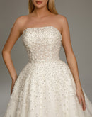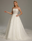 فستان زفاف فاخر باللون الأبيض العاجي يتميز بقصة أنثوية على شكل حرف A، مصنوع من التول الناعم ومزين بتطريز يدوي معقد باستخدام اللؤلؤ والخرز والكريستالات والزخارف الزهرية.