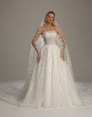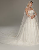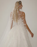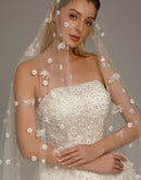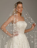 يكتمل التصميم بحجاب شفاف طويل يصل إلى الأرض مطرز بنقش متناسق، مما يضيف لمسة حالمة ورومانسية.