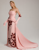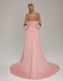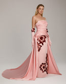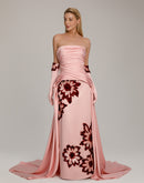 هذا الفستان الوردي الفاتح هو توليفة أنيقة من الأناقة والأزياء الراقية، مُفصل من قماش الكريب الفاخر مع صدرية مجعدة وتنورة ضيقة مزينة بتطريزات زهرية فاخرة مرصعة بالترتر اليدوي. تضفي القفازات...