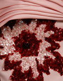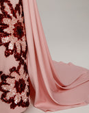 هذا الفستان الوردي الفاتح هو توليفة أنيقة من الأناقة والأزياء الراقية، مُفصل من قماش الكريب الفاخر مع صدرية مجعدة وتنورة ضيقة مزينة بتطريزات زهرية فاخرة مرصعة بالترتر اليدوي.