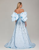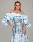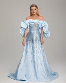 فستان سهرة فاخر باللون الأزرق الفاتح، مصنوع من قماش الكريب الملكي ومزين بتطريز يدوي أنيق يتلاشى تدريجياً نحو الحاشية. الجزء العلوي مصنوع من التفتا، مصمم بأكمام جريئة ومنحوتة تعزز فخامته....