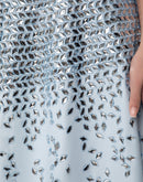 فستان سهرة فاخر باللون الأزرق الفاتح، مصنوع من قماش الكريب الملكي ومزين بتطريز يدوي أنيق يتلاشى تدريجياً نحو الحاشية.