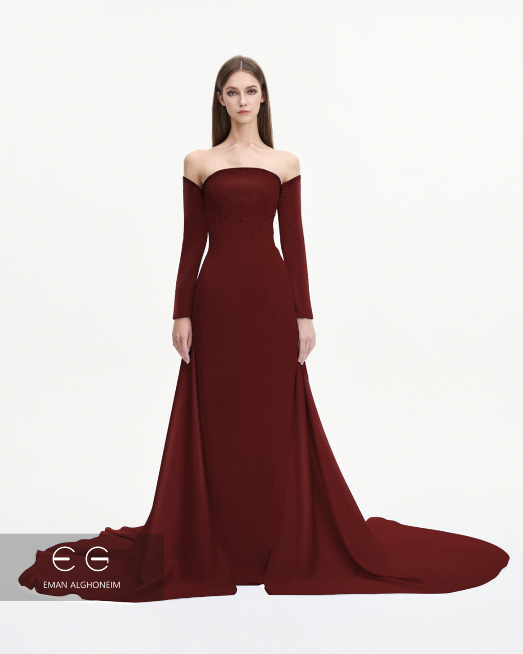 فستان أنيق بدون أكتاف بلون مارون ناعم مزين بخرز مارون وأسود دقيق لإضافة لمسة من الفخامة.