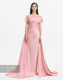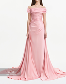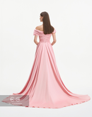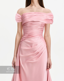 Elegant baby pink dress made of crepe fabric, featuring an off shoulder design and soft drape at the bodice and waist.