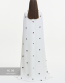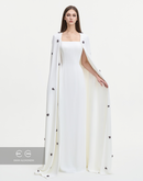 An elegant white dress with a cape adorned with beads in the shape of flowers, adding a touch of beauty . The design shines with Swarovski details that reflect light...