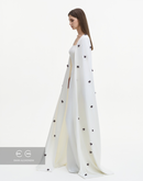 An elegant white dress with a cape adorned with beads in the shape of flowers, adding a touch of beauty .