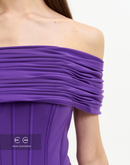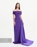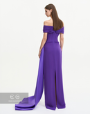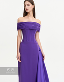 Elegant purple dress made of crepe fabric with an off-shoulder design, featuring a flowing silk side panel that adds a touch of luxury and fluidity.