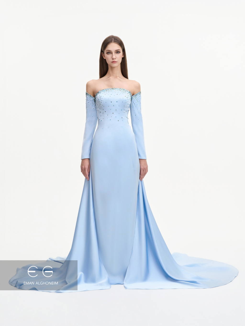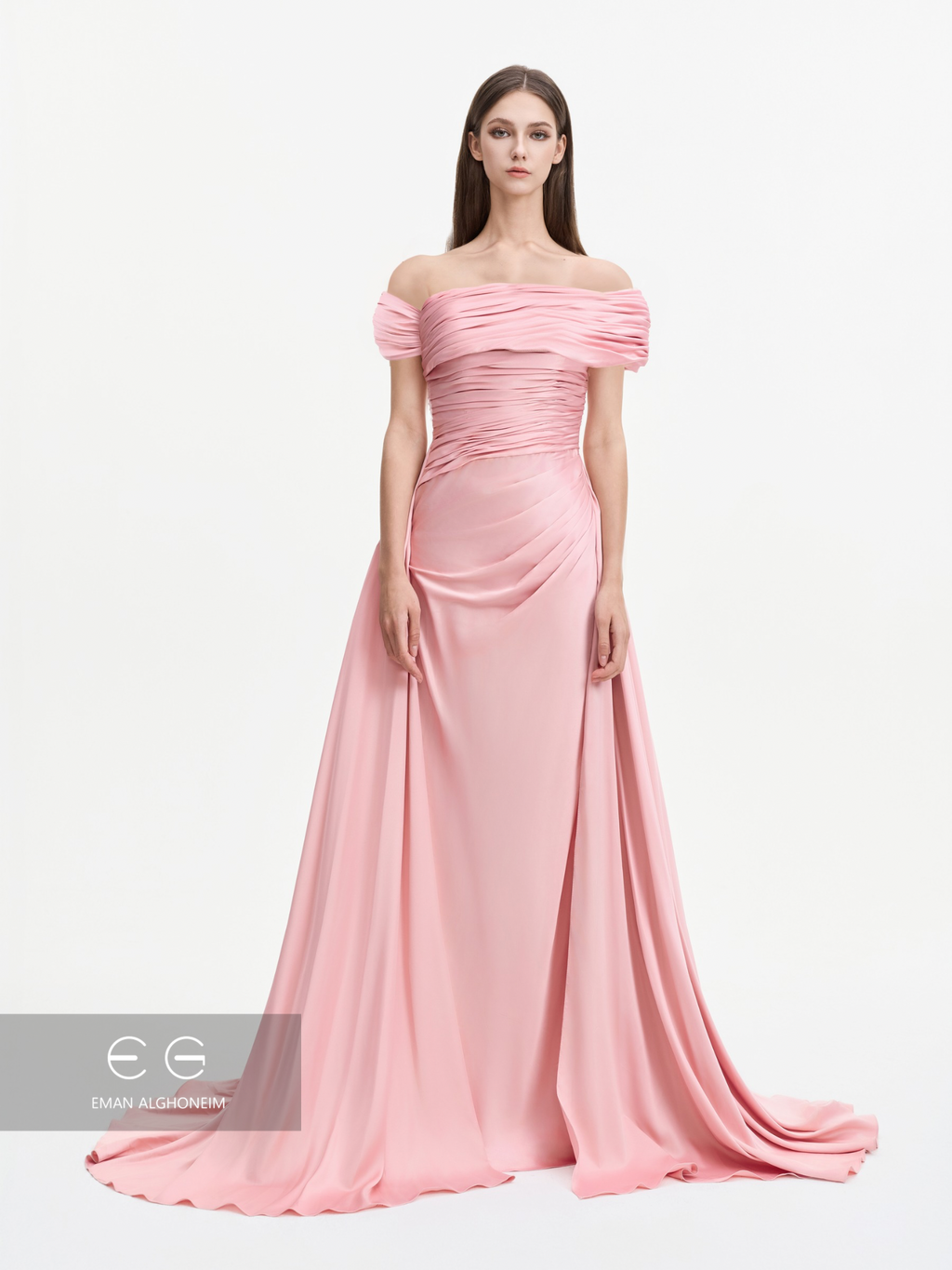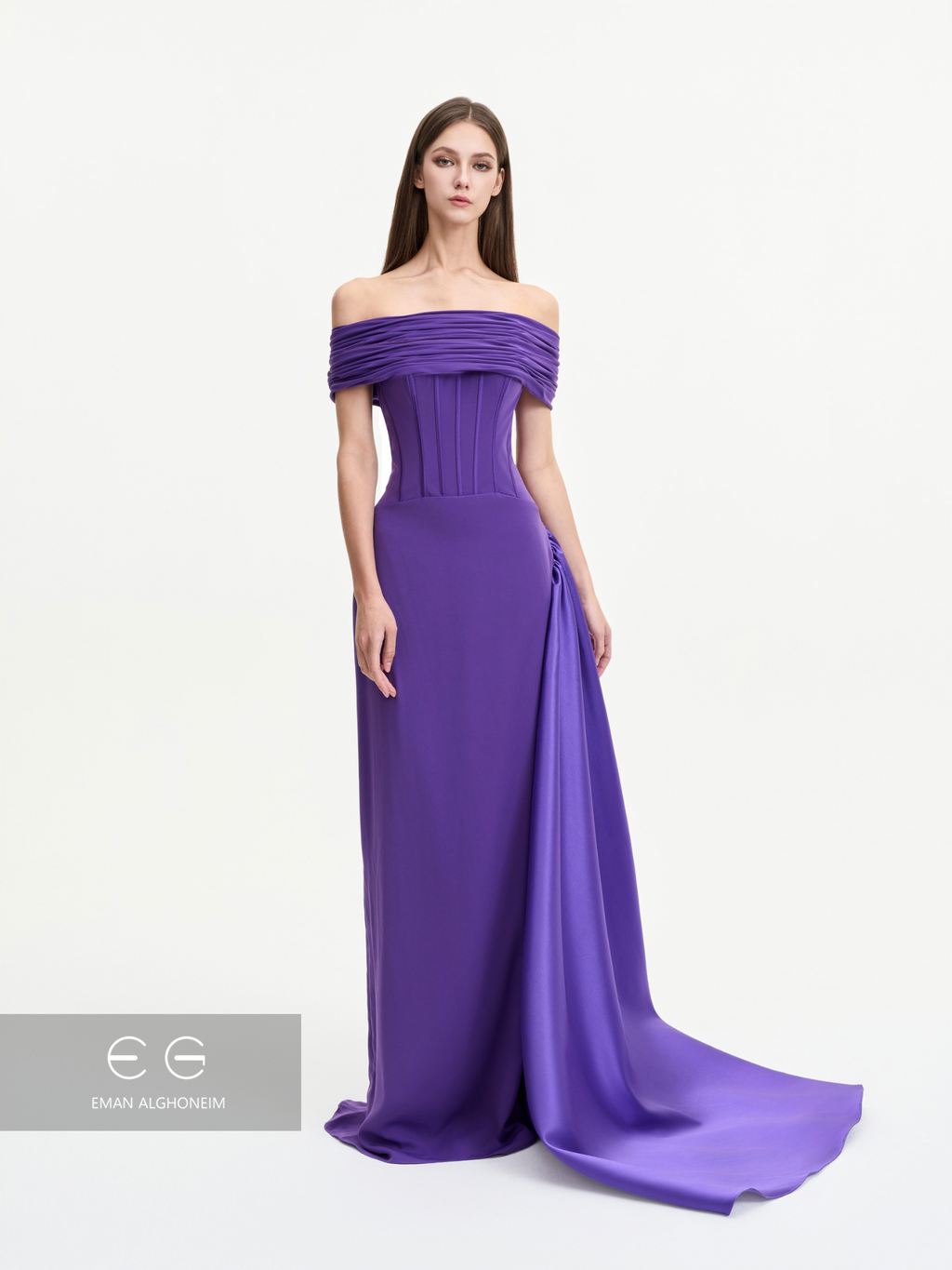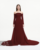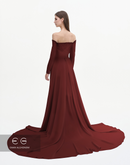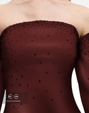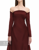Elegant off-shoulder dress in a soft Maroon embellished with delicate maroon and black beads for a touch of luxury. Made from smooth and flowy silk , featuring a fitted silhouette that drapes beautifully for a refined and graceful look.