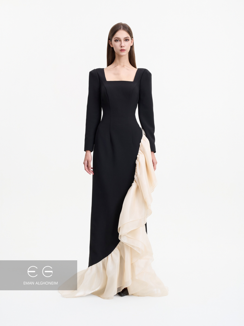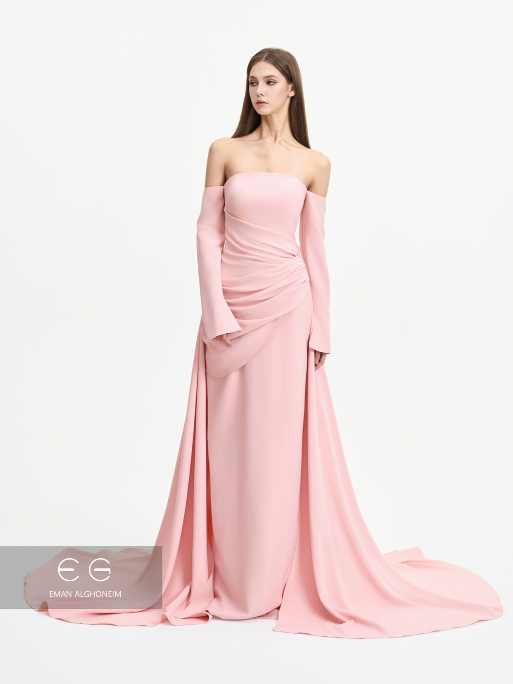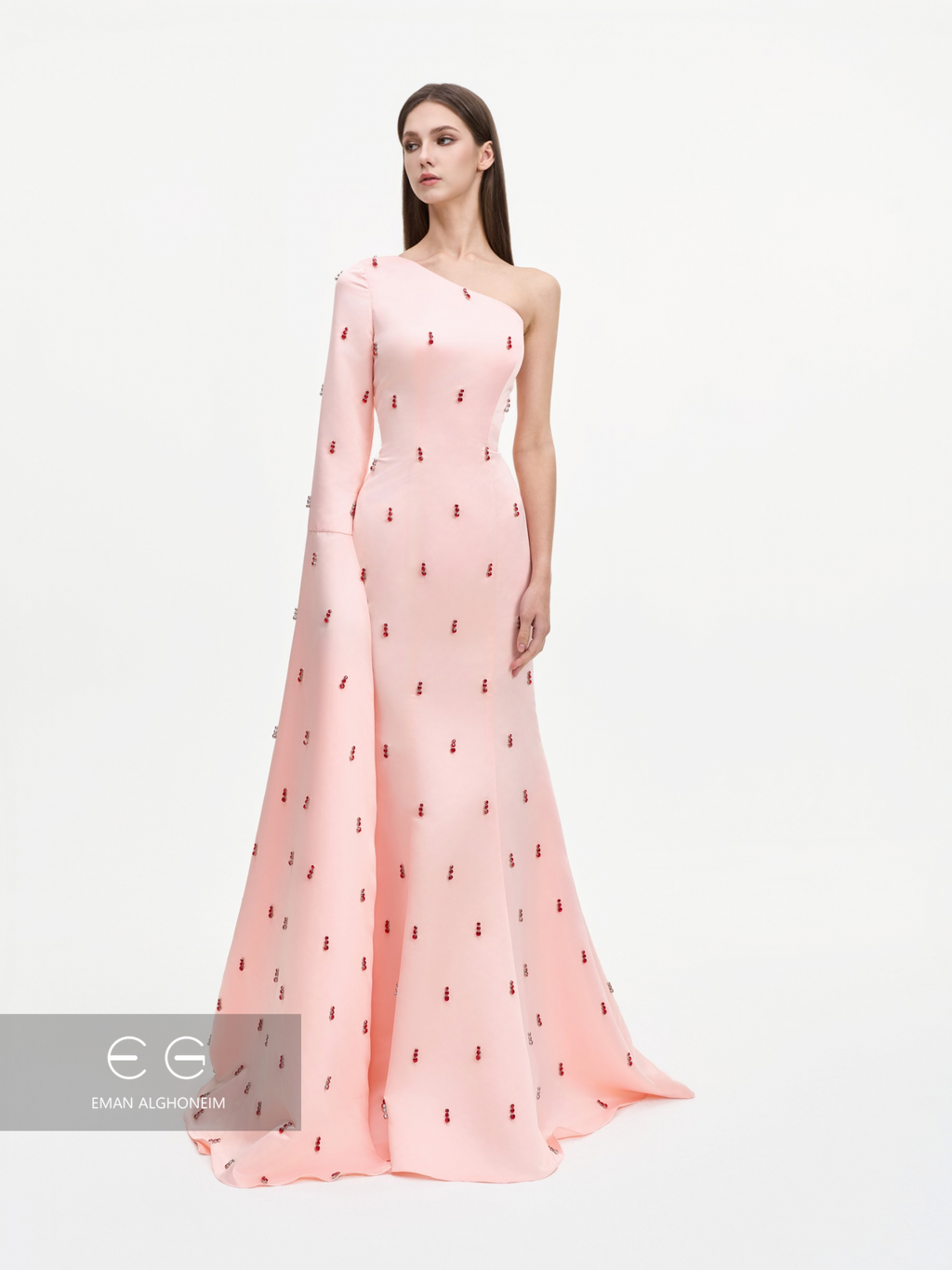 Elegant off-shoulder dress in a soft Maroon embellished with delicate maroon and black beads for a touch of luxury. Made from smooth and flowy silk , featuring a fitted silhouette that drapes beautifully for a refined and graceful look.